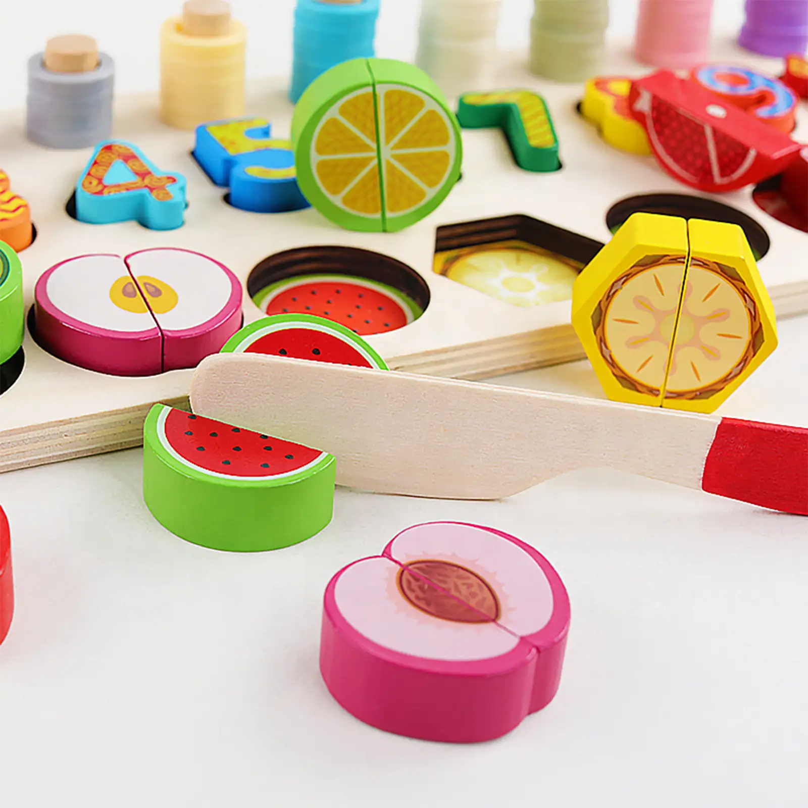 Unlock your child’s potential with this vibrant, multi-functional Montessori puzzle! This all-in-one wooden board features colorful numbers 1–10, math symbols, a rainbow ring stacker for counting, and “sliceable” wooden fruits with a play knife. It is the perfect tool for developing fine motor skills, hand-eye coordination, and early numeracy in a fun, tactile way.
