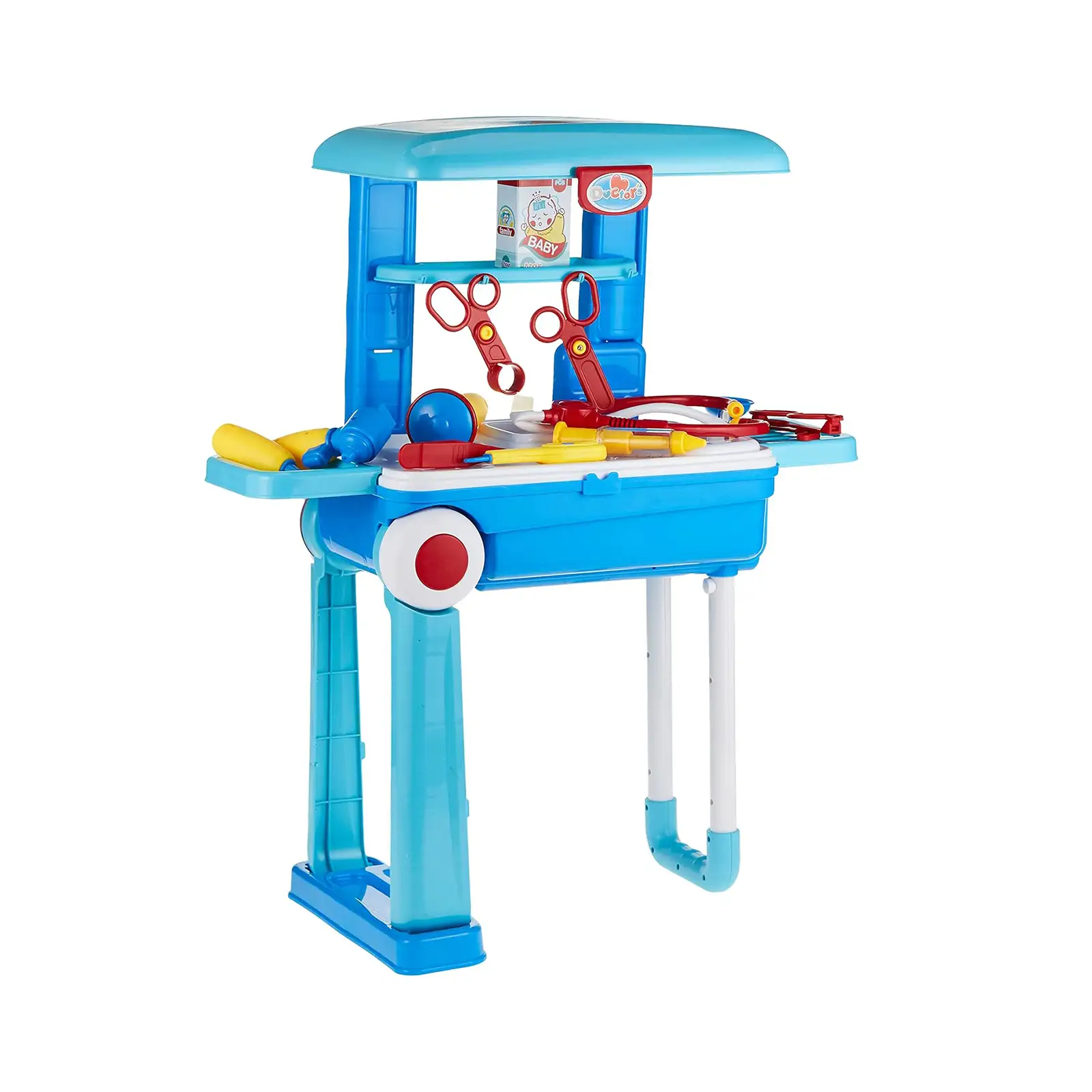• There’s a handle on the side of the doctor set so that you can lift it, and it’s also a trolley with wheels that you can pull, so kids can easily take it everywhere they go.
